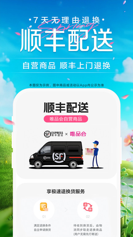 7天无理由退货,自营商品免费上门收件(自行寄回返10元唯品币);