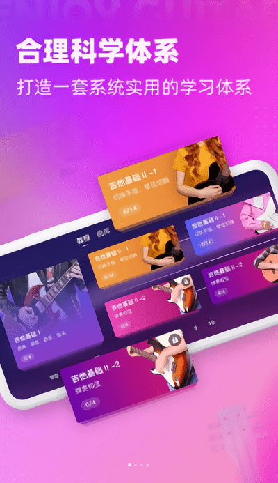 3,优质课程,强化提高,趣学吉他app中建立了非常完善的数据模式来进行各种优质其他课程的导入和上传,用户自己可以点击和播放各种课程来进行学习。