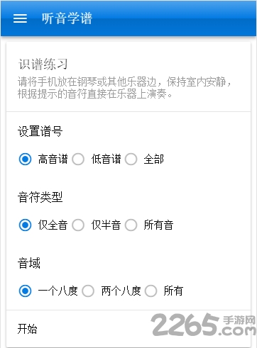 1、在演奏前,可设置谱号、音符类型、音域,设置之后,点击开始即可。
