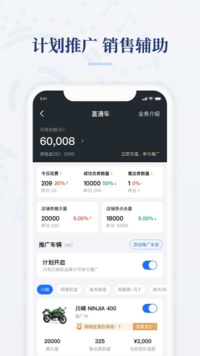 摩托范商家版(哈罗摩托商家版),为万家摩托经销商提供在线售车、摩托车报价、库存管理、线索管理、人员管理、在售车型管理、店铺运营、批发、数据报表等综合性服务。是摩托车经销商拓展销售渠道和摩托车销售的好帮手。