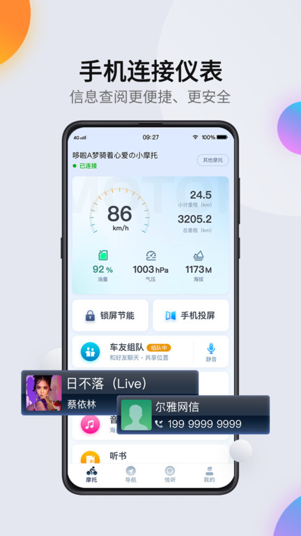 专属智能骑行助手APP,专门为摩托车提供手机连接到摩托车仪表屏使用。在骑行中安全便捷的在摩托车仪表中查阅信息、准确导航、来电提醒、微信提醒等手机基础功能。