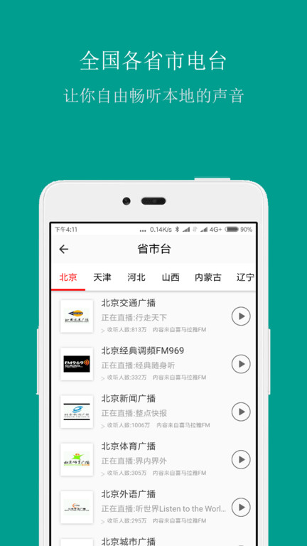 5.FM手机调频收音机涵盖 音乐、新闻、经济、交通、都市、体育、外语 等分类满足每个人的需求.