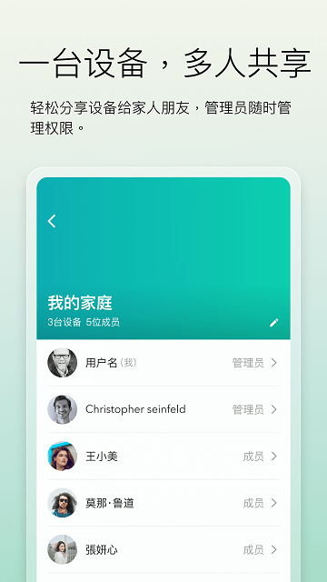 1、一台设备,可以多人共享,家庭成员可以随时控制设备;