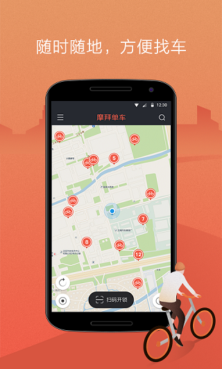 开锁指南:在每辆摩拜单车的车身,车把与锁上都印有二维码,您只需用手机简单一扫,车锁就会自动打开。