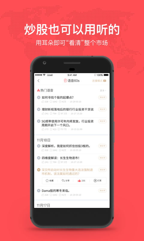 听股票,用耳朵聆听市场资讯,用耳朵学习战法课程!让您随时随地将知识收入囊中!众多名家汇聚,为您简单、快速、专业的解决知识盲区.为您的生活增添一份知识的庇护!