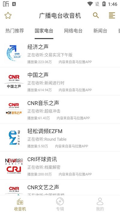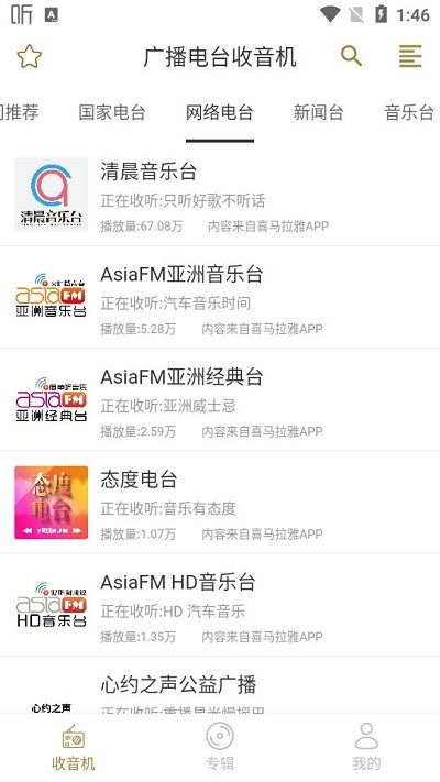 2.这里有国家电台、网络电台、新闻台、音乐台等多个栏目可以选择