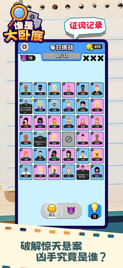 《谁是大卧底》脑力与逻辑的终极挑战,融合了脑力游戏和逻辑谜题的独特体验,专为喜欢挑战智商并享受神秘解谜乐趣的成年人设计。在这个游戏中,你将沉浸在复杂的谜团中,运用推理技巧找到罪犯,保护无辜的人,解开错综复杂的情感纠缠。