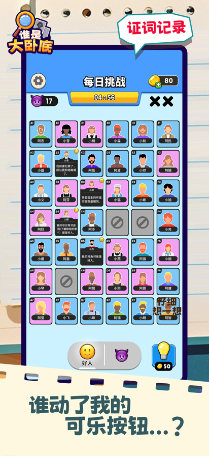 游戏中根据第一个卡牌的人物文字提示来逐渐的找出好人和坏人,每一个人下面都会有文字提示的。