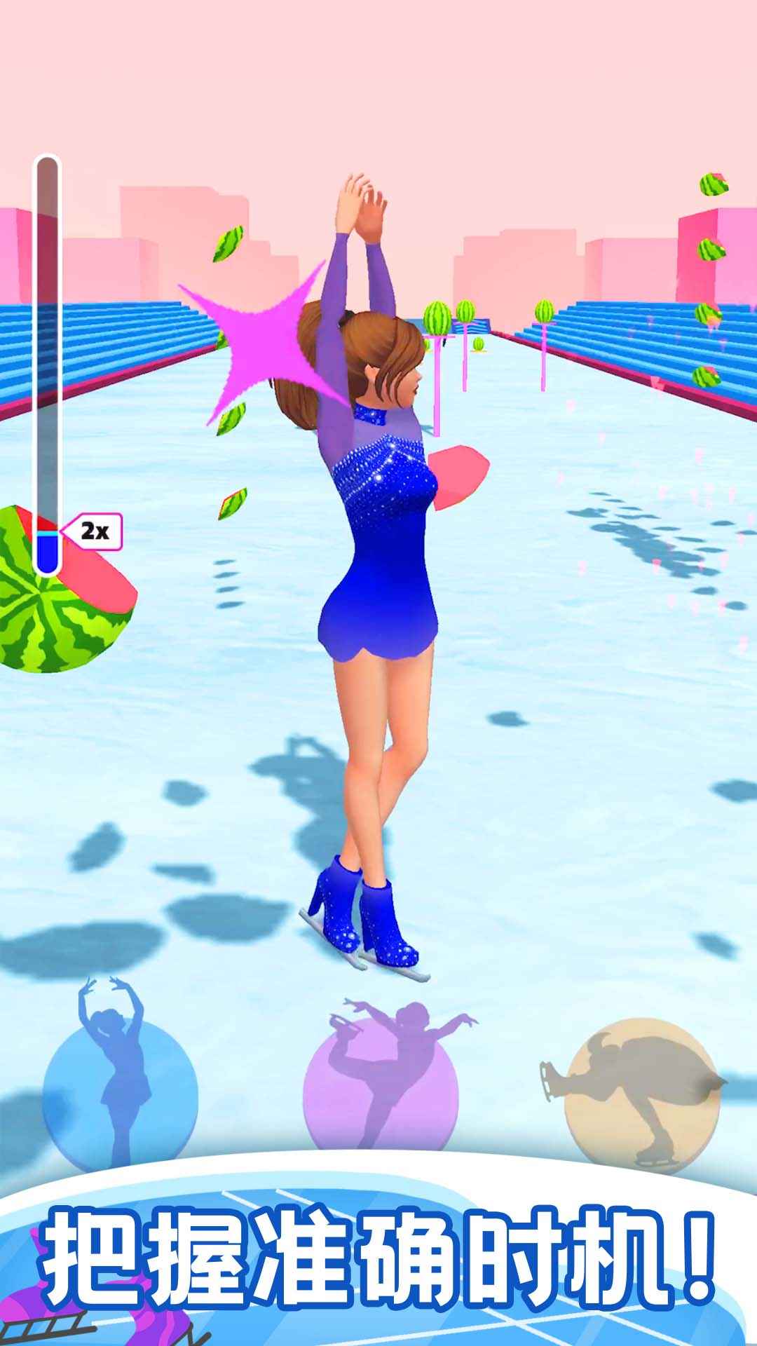 针对不同的比赛关卡设计了不同的滑冰动作。