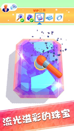 2、高自由度的游戏玩法:游戏里面玩家可以可以利用打磨工具随意打造钻石,将钻石摆放在自己的珠宝店进行售卖,还可以根据自己的想法制作出各种类型的钻石,系统自动评估价格。