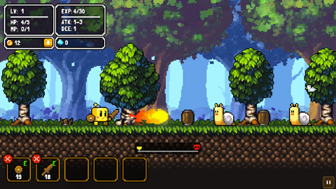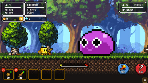 每次开始关卡时,角色都会从头开始(等级保留)初始玩家会带有木剑、木盾和一小桶泡面。好好利用这些道具是初期的生存之道。打倒怪物会掉落金币和经验,积累经验等级会提升,主角的各项属性也会提升。