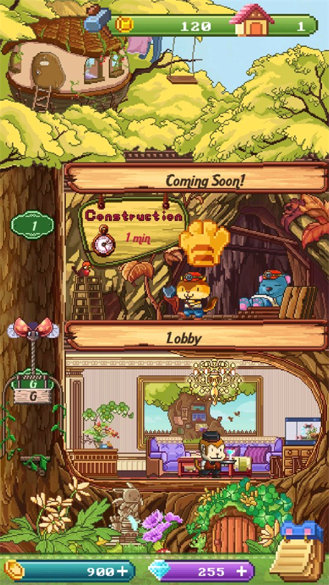 游戏画面也是小编推荐这款游戏的理由之一,Q版的动物角色,像素风格的画面及场景除了给人一种萌感,游戏的一些细节也处理得精致。玩家可以进行建造的商店、花园、点心店等娱乐设施,在这些娱乐设施中每一层还可以雇佣三个动物员工,它们会负责进货与接待客人,而不同能力员工的工资也是不同的,需要扩张时玩家必须尽可能的请来那些能够为巨大树屋带来更多利润与人气的动物,这样我们才有资金将巨大树屋建得更高更豪华。