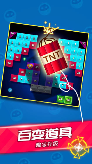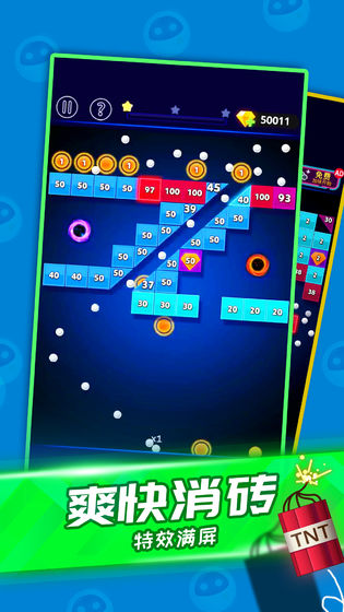 开局就送一百个球!这是为各位消方块高手精心准备的舞台,娱乐性超强,弹球能力升级,多种模式选择,各种道具技能隐藏等你来发掘!只需要几分钟你就能爱上这款游戏,快来把你的烦恼像方块一样统统击碎!~
