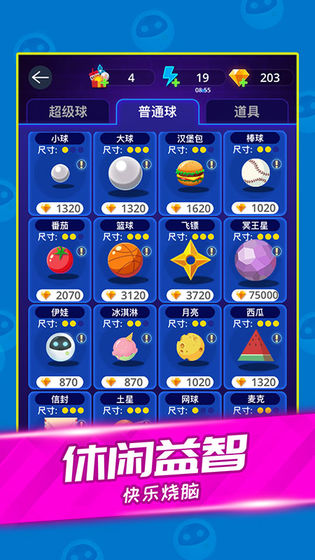 游戏挑战:多种模式选择,上百种关卡设置,多种神秘小道具增加弹球威力!是对你手速,耐心和判断力的多重考验!