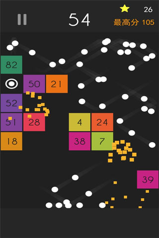3、当玩家瞄准后松手,球球会沿着瞄准线的方向发射出去。发射出去的圆球,会在方块之间,方块与墙壁之间,来回反弹,不断减小方块的数字直到消除方块或圆球弹回地面。