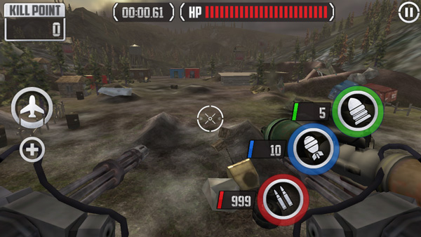 游戏全屏任何一个地方都左右拖动然后点击屏幕射击,游戏中没有防守,只能通过瞄准器瞄准攻击敌人,才能够保卫高地。武器虚拟按钮位置不合理,很容易在发动攻击时触碰到,游戏整个操作感有点滞后。