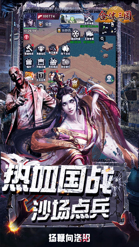 合体三国官方正版是一款好玩刺激的末日题材三国策略放置手游,游戏的背景是在未来世界丧尸病毒爆发,人类几近灭绝,邪恶科学家们为了称霸世界找到了复活死去之人的方法,而第一批被复活的对象竟是三国神将,三国神将魂回救世,时隔2000年再度征战洛阳。玩家将作为幸存者,你需要在这末日世界里组建战术小队,指挥拥有现代科技武装的三国武将,展开激烈的资源争夺战。在这个世界中,玩家需研究科技、锻造武器、强化基地、提升经济,并寻找抗毒血清,拯救感染的同伴,目标是组建最强英雄队伍,征服末日世界。