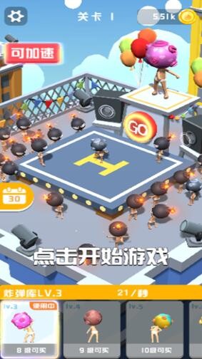 爆破拆迁了解一下游戏在这里你将化身为超级炸弹人,你的任务就是把城市中废旧的房屋全部都炸毁,控制自己的投掷的方向把手中的炸弹顺利的投到对面的房子中,如果你可以完美的摧毁房屋就能获得大量的金币奖励,不断的升级自己的等级,从而提高自己炸弹的威力,你点击屏幕时间的长短决定着你在投掷时炸弹飞行的远近,一定要控制距离的把控。