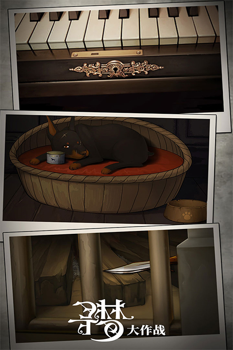 1、根据狗窝,画像,棋盘,地毯得出沙发旁箱子的密码,拿到狗粮罐头给狗狗吃,得到棋子,完成棋盘游戏(如图)拿到钥匙开琴。