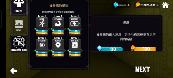 2、您可以使用金币或宝石升级您的属性,升级之后点击下一步。