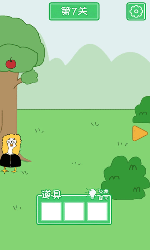 箭射出去后,点击向左箭头到左边去。在左边,点击躺在草地上的鸭子和苹果,接着点击向右箭头到右边去。