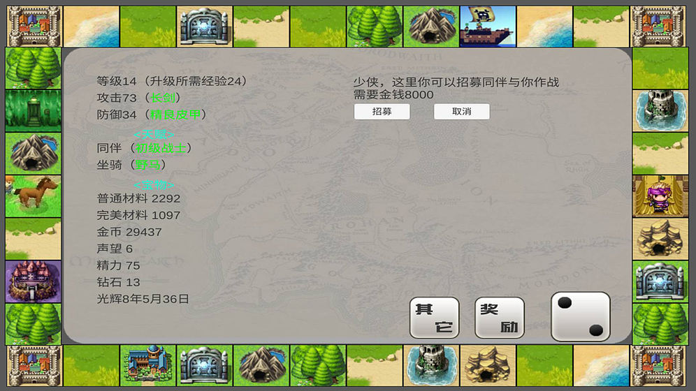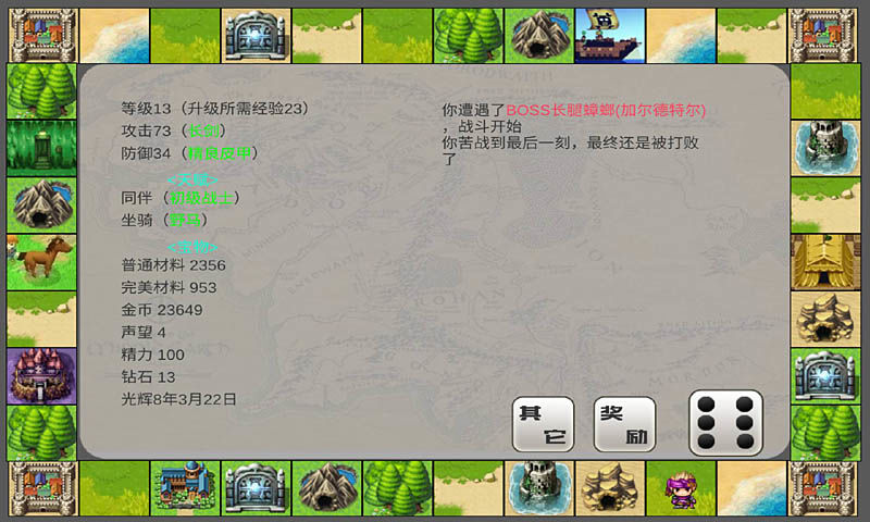 在这个趣味的精彩大陆中不断的探索和挑战,你极爱那个会投掷筛子决定你的行动,不断的到达各种地方体验各种战斗和决策。