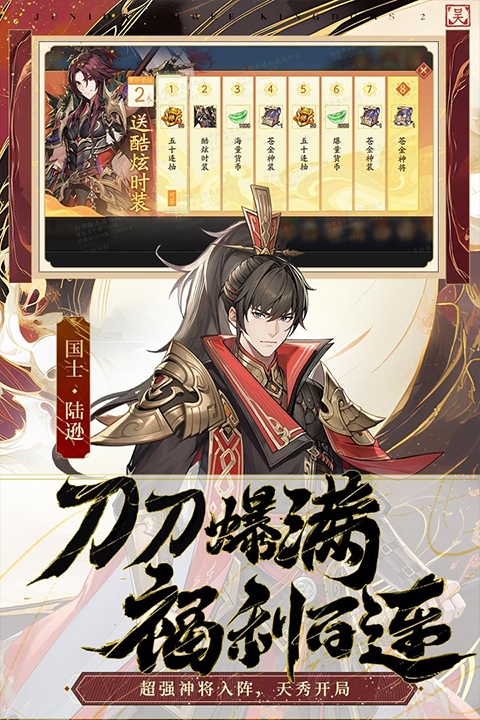 首发期间,为少年们准备了丰富的登陆好礼~少年们只需八天登陆,就可以获得20连抽、精美时装、海量元宝外加绝世宝物,自然是我全都要,助少年畅游三国世界