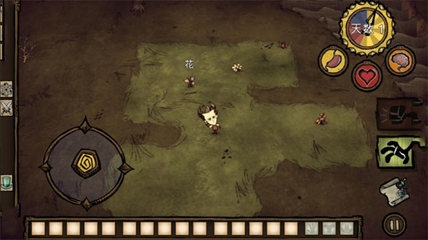 5、游戏就正式开始了,左边是控制角色方向的,右边是收集的,玩家需要收集一切能被利用的资源来躲避饥荒。