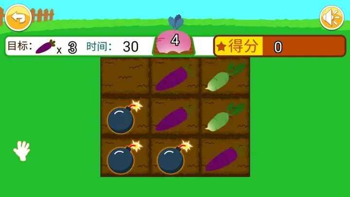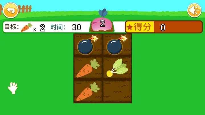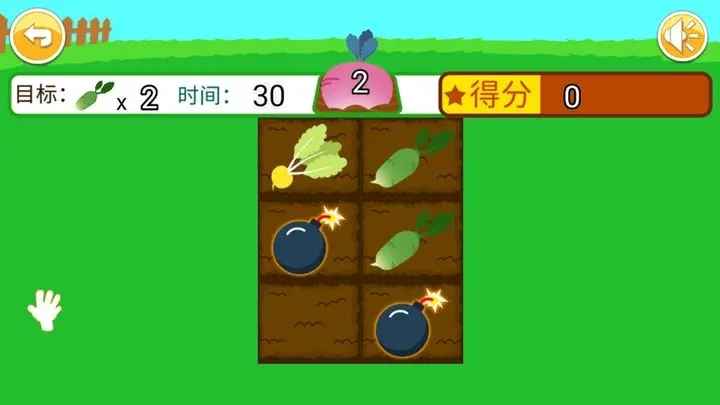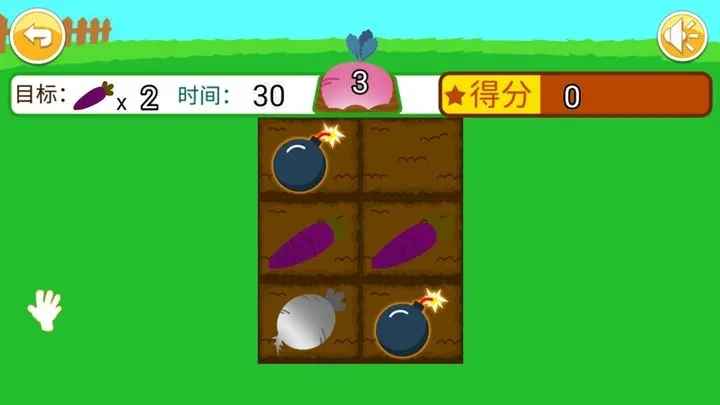 儿童记忆拔萝卜游戏是一款锻炼儿童记忆力的游戏,在这款游戏中将有不同颜色的萝卜在同一块田里儿童需要记住颜色后选择正确颜色的萝卜将其拔出,如果记错了则需要扣分,十分适合锻炼儿童的记忆力,感兴趣的朋友快来下载吧。