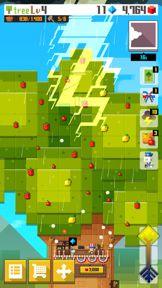 (1)树枝上结出的像素果我们只要一直点击树枝,树枝摇晃就会落下像素果,落下的的即为获得糖果,值得我们注意的是像素果长出来的速度是比较慢的,但是我们可以点击右上角的云朵符号就会到达天空,一直点击天空的云朵就可以产生乌云,乌云会产生闪电以及雨树就会快速结出像素果。