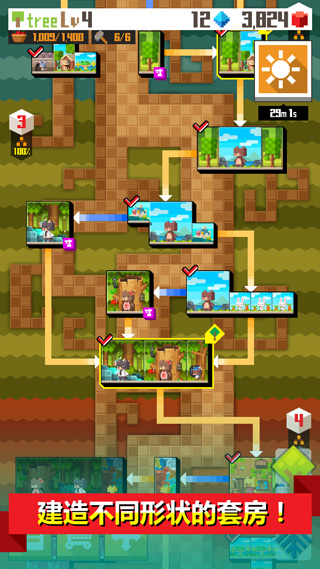 这款游戏一共分为3个部分,上面的树枝,中间的树干,下面的树根。树枝会结出像素果,像素果以及钻石就是这款游戏中的货币,树干则是我们为各种动物制作房屋的地方,而树根则是指引我们铸造房屋的地方。