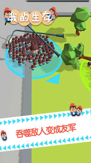 针对于游戏的玩法其实很简单,只需要在两分钟内尽可能的汇聚更多的人员即可,期间如果遇到强大的对手尽可能的规避,遇到白色且没有归属的人员就靠拢将其纳入团队之中,另外随着人员的变多,速度会原来越慢,但强力的攻击能为你消除更多的障碍,例如墙、树等等都可以直接推到。