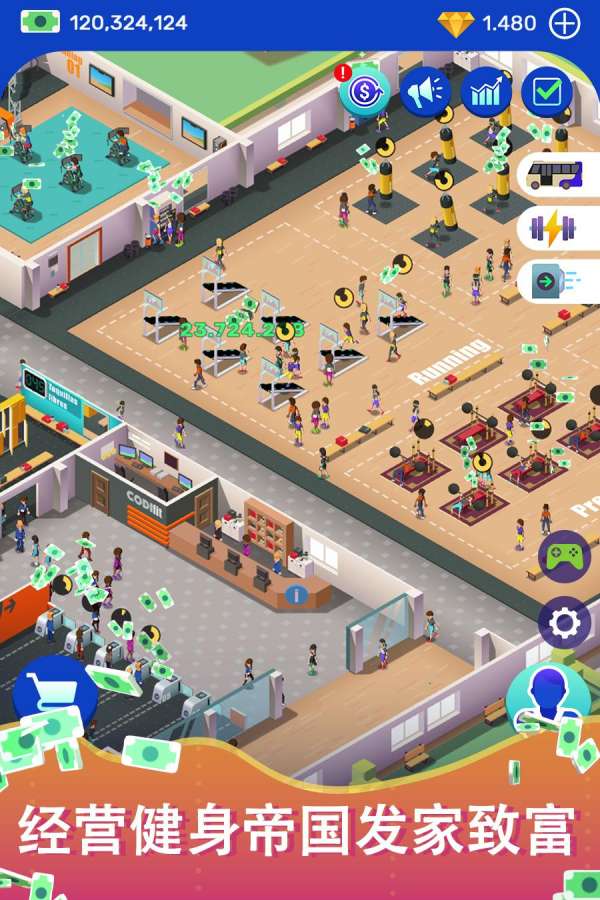 懒散的健身大亨最新版是一款模拟经营游戏,作为健身房的老板要时时刻刻查看店内的生意如何要通过宣传的方式让顾客熟知自己的健身房,只要有健身房名声越响那么前来健身队顾客会越来越多那么自然而然的挣到利益也就会越多。
