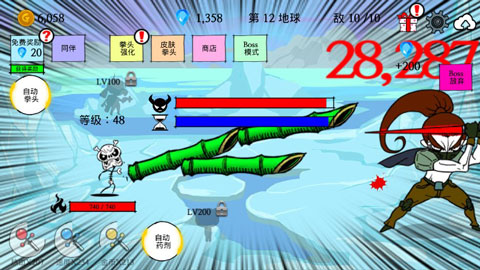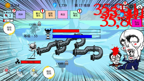 玩法:游戏玩法简单,以击杀迎面而来的BOSS为目标闯关推图即可,开启自动拳头和自动药剂挂机就可以了。