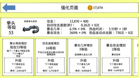 强化升级:面对着越来越强的BOSS,低等级拳头等级和强度肯定无法应对,所以要强化拳头的各项属性来应对着敌人,帮助你更加轻松的致胜。