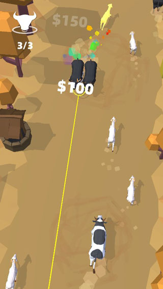 游戏玩法:通过投掷绳索,来拉回沿途不断狂奔的动物,离你越远的动物肯定越值钱,而且像金色的动物金币会加倍,期间提升绳子的长度和增加套索能够容纳的动物个数都是增加收益的一大途径,另外离线收益随着你的升级也会不断的增加。