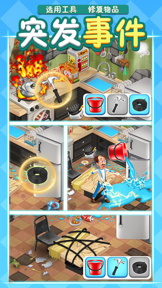 3、花式轻松拯救家园小能手。无论是作为开锁匠、水电工、还是家电维修员都能手到擒来。购买新的豪华家具来打造梦幻家园,做出正确的选择救救小姐姐与危难之中!
