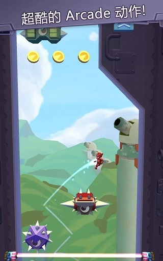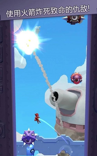 游戏的基本操作十分简单,只需要点击屏幕,主角就会以斜方向喷射火箭背包,一定有人问为什么非得是斜着喷,这个问题我也很想知道。但由于是斜着喷射,想要上升就需要不断点击屏幕来让主角以闪电的形状上升,只要不点击屏幕,主角就会在喷射结束后以一个简单的抛物线向下降落。