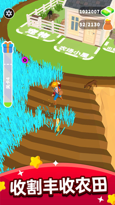 收割大师游戏是一款十分解压的模拟休闲手游,灵感来源于庄稼收割,在这里玩家需要将已经成熟的庄稼尽快收割,为下一个季度的种植做好准备。滑动屏幕可以操控角色移动,前往农场区域,角色会自动挥舞镰刀进行农作物的收割,将收集好农作物通过市场买卖可以换钱。在富裕资金的支持下,扩建农场,升级装备,以此来提升收割效率,除了以上玩法玩家甚至还能养育宠物,搭配爽快般的割草快感,带给带来更多意想不到的乐趣!