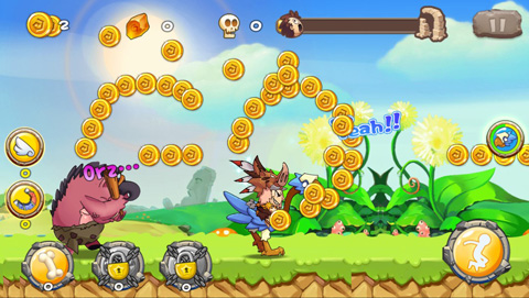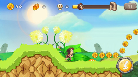 在该游戏的界面右下角是控制角色的跳跃按键,玩家在按两次跳跃按键可以主角跳的更高,而左侧是减缓野猪追击的丰富道具,“骨头”可以有效减缓野猪的速度、“捕兽夹”可以使野猪摔倒、“石斧”可以将野猪打飞。