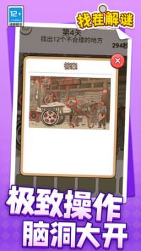 找茬解谜安卓版是一件有趣的闯关小游戏,每个关卡里都有很多不易观察的不同点,玩家要找出这些场景里的不同才能顺利通关,通关之后会获得游戏颁发的奖励,帮助玩家更好的推进游戏发展。