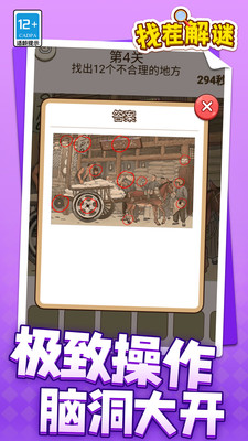 找茬解谜是一款拥有海量关卡设计的找茬类游戏,丰富的解谜任务可以训练你的思维,眼力以及手速,在不同的关卡中挑战找到不同的地方,或者不合理的地方,顺利通关可以解锁出新的关卡,以及道具奖励,感兴趣的玩家赶紧来下载找茬解谜安卓版试试吧。