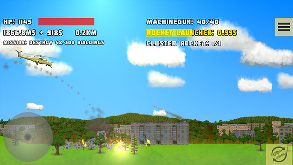 - 在不同的建筑物上射击你的火箭,看着它们倒塌。