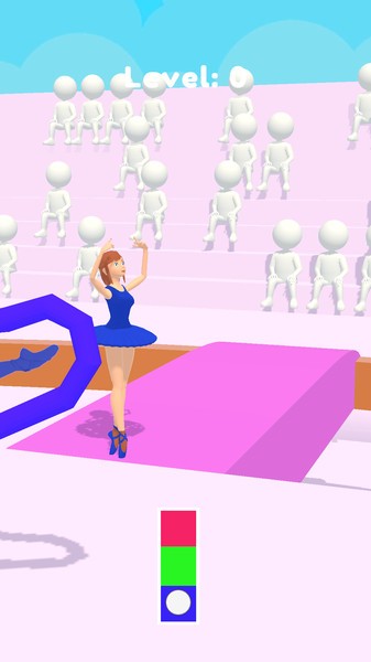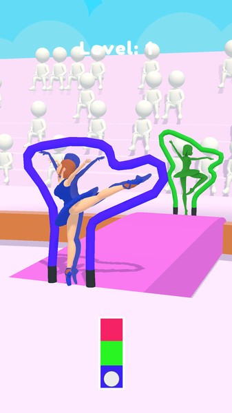 游戏中玩家将控制一个美女去冒险,前方会出现各种不同的舞姿,玩家需要控制角色做出相应的动作来通过这些障碍物,操作起来也比较简单,就是选择对于的颜色即可。