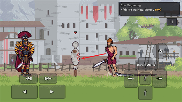6、点击屏幕右下角的各个攻击按钮,以对自己面前的稻草人实施攻击。