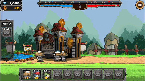 6、为了对抗强悍的魔神,训练猫族战士,雇佣喵星英雄,合理搭配远近兵种、把握时机释放英雄技能消灭敌军,保护好我方营。