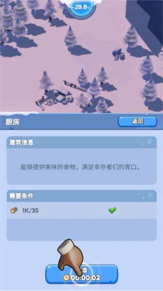 有了火种,解决了取暖问题,同样也可以解决生火做饭的问题。点击地图上的位置,打开建筑面板,先来建造一个厨房,为幸存者提供美味的食物。