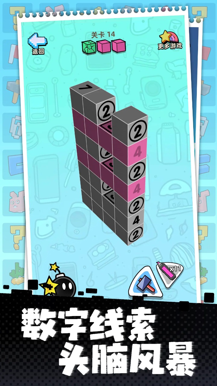 游戏有3d解谜玩法,玩家要点击对应数字的方块去消除方块。