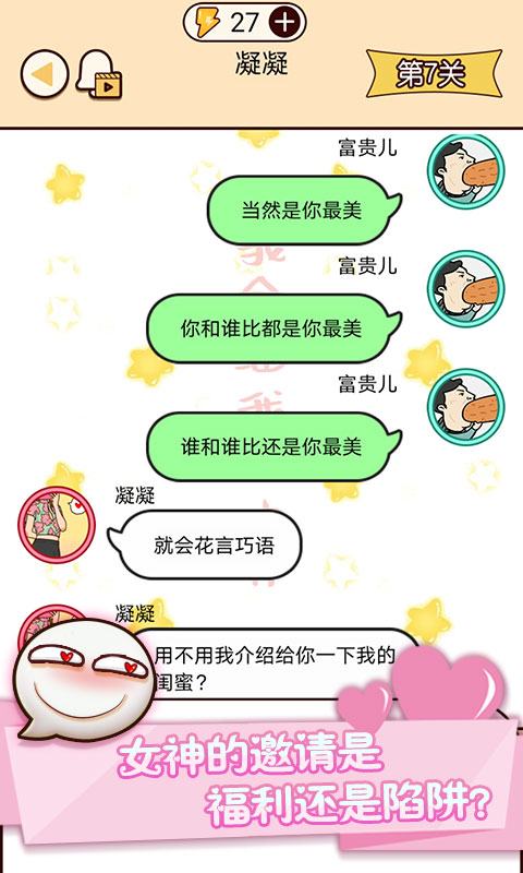 这是一款好玩的模拟聊天游戏,而且在游戏中,你将面临两种选择,不同的选项将引导您走向不同的结局,根据关卡关键词判断是否成功,超过50个关卡的超级富豪故事正在等待你解锁,超过10种不同类型的小游戏可以供你完成。