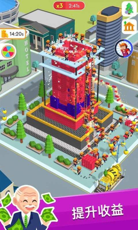 盖楼我贼溜手机版是一款很有趣的手机游戏,并且采用了很可爱的卡通动画形象设计,玩家在游戏中扮演的是一个建筑方面的大老板,需要不断的去招募员工,然后匹配高能力的机器去建造大楼